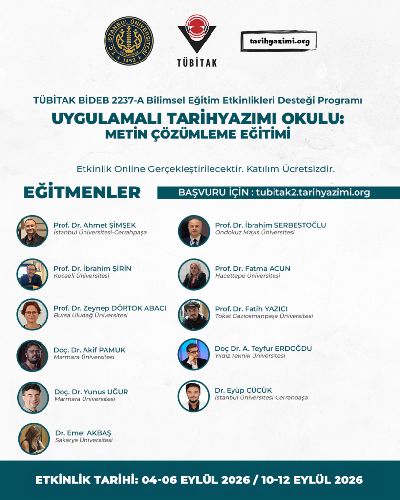 UYGULAMALI TARİHYAZIMI OKULU: METİN ÇÖZÜMLEME EĞİTİMİ DUYURULAR Etkinlik EğitmenleriPlanlanan Etkinliğinimizin eğitmenleri ile ilgili afişimiz.. Katılımcı Listesi AçıklandıEtkinliğe kabul edilen katılımcıların asil ve yedek listesi açıklandı